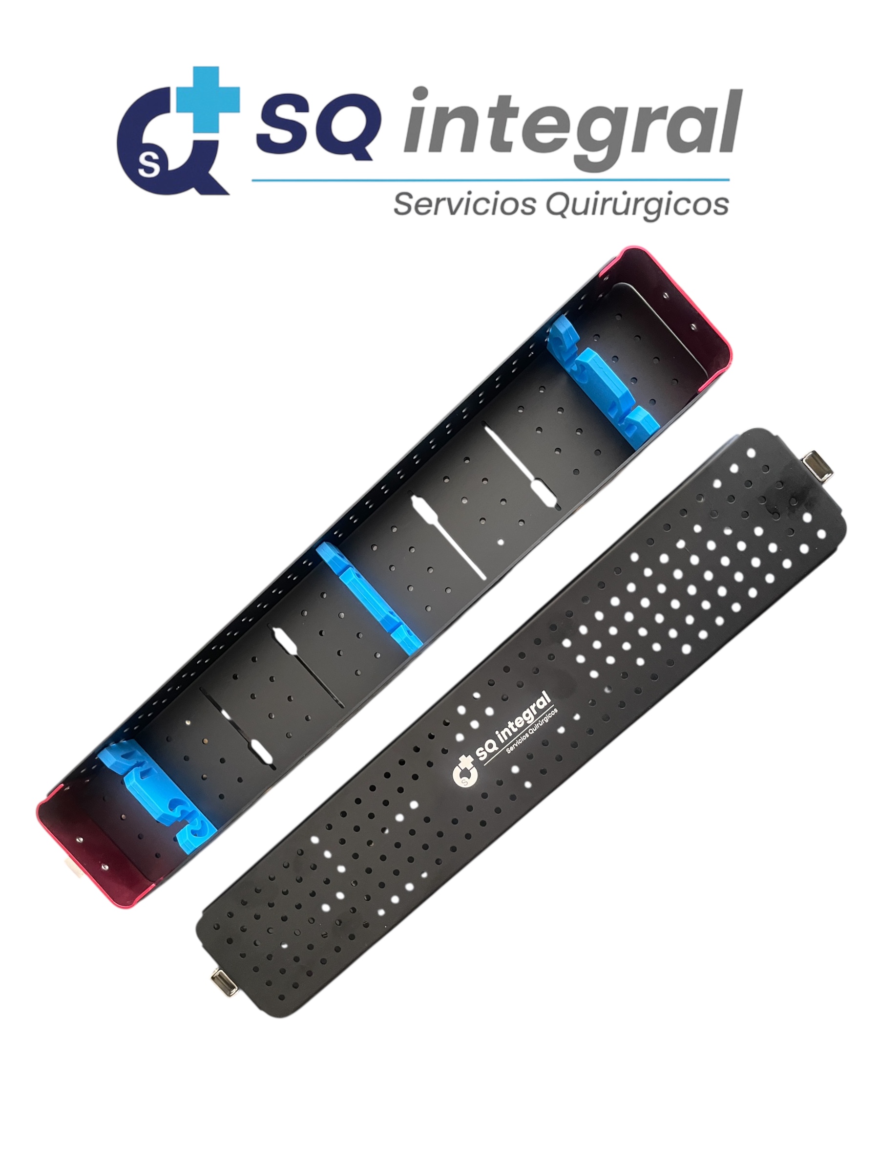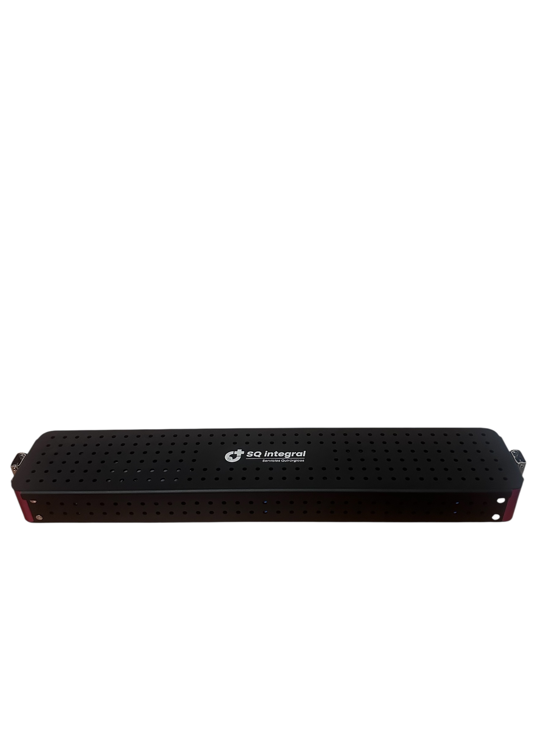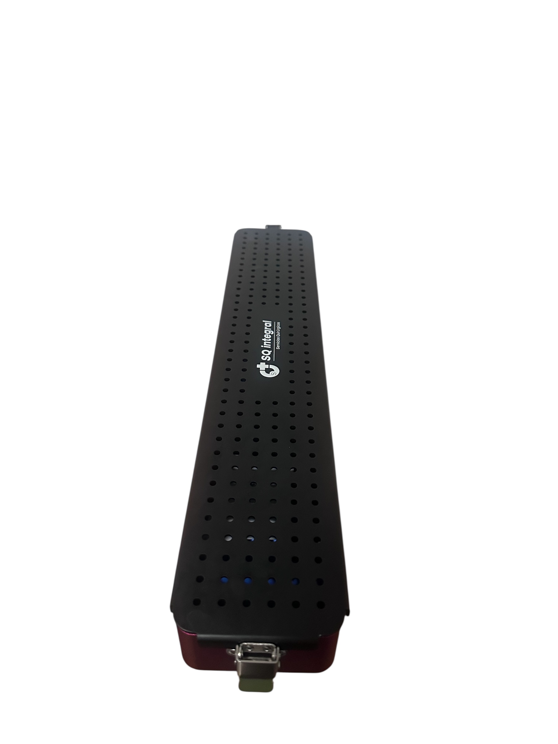 Caja para esterilización de ópticas de aluminio con soporte de silicona. Diseñada para proteger y organizar ópticas durante el proceso de esterilización: Medidas: 45.5 x 8.5 x 4.5 centímetros.