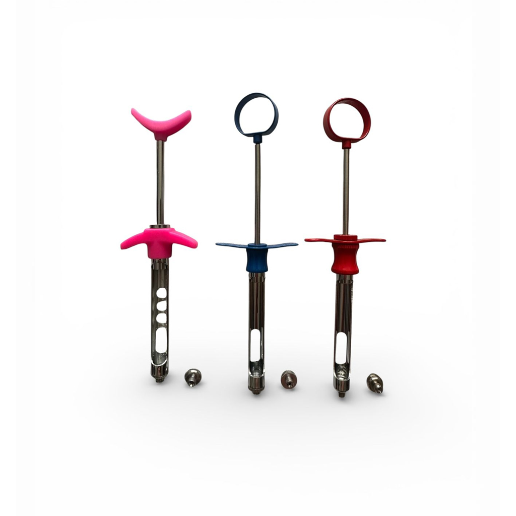 Fabricada en acero inoxidable de alta calidad, esta jeringa ofrece resistencia, durabilidad y facilidad de esterilización. Además, incorpora componentes ergonómicos que facilitan el agarre y el control durante la aplicación.