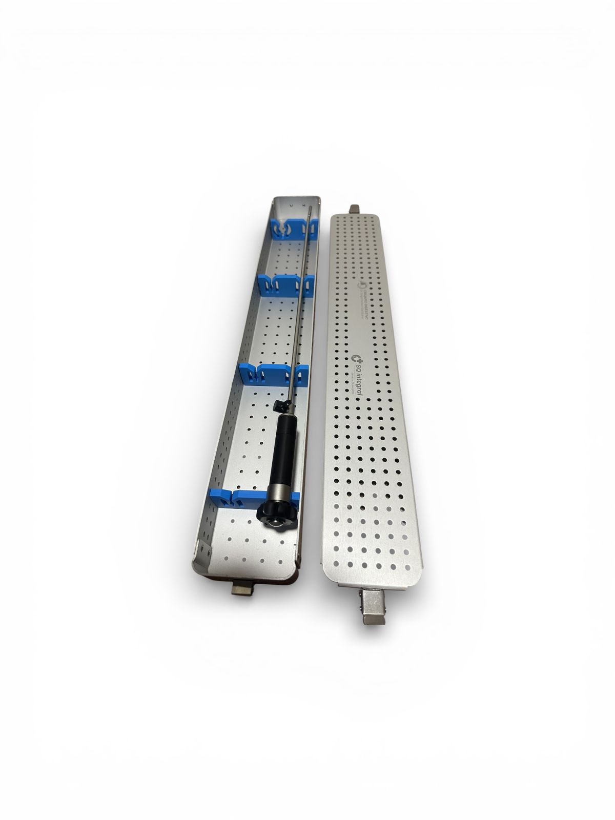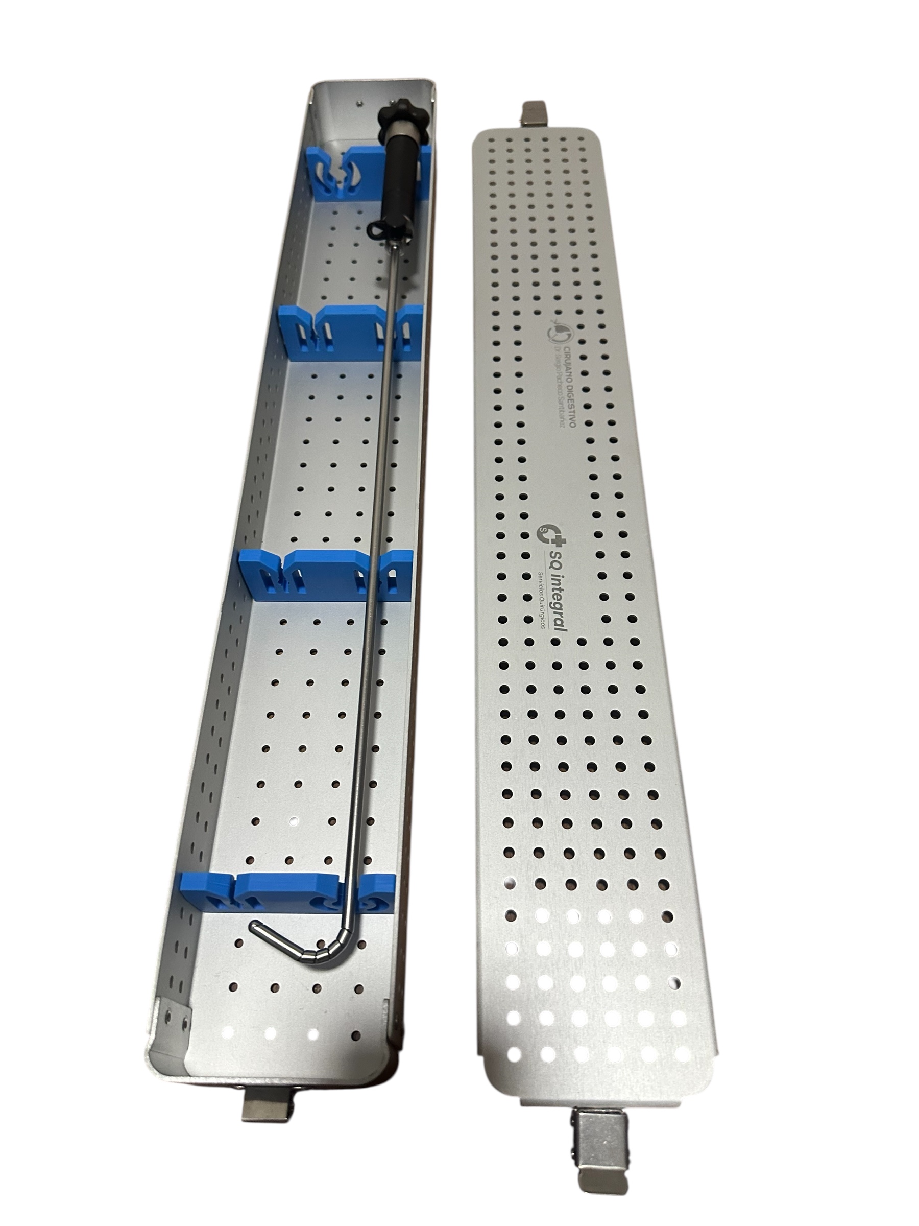 El instrumento se presenta generalmente acompañado de una bandeja de esterilización perforada, que permite su almacenamiento seguro y facilita los procesos de esterilización hospitalaria.