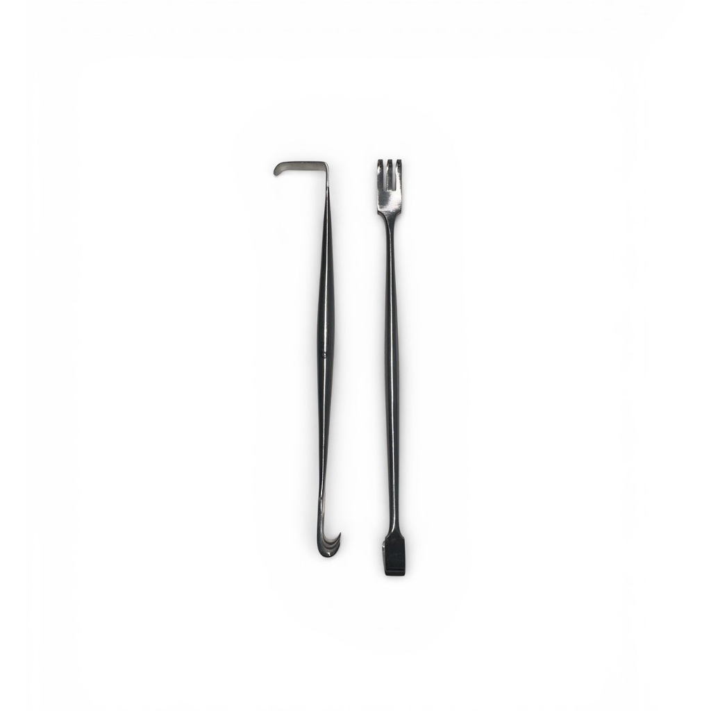 Este separador cuenta con dos extremos funcionales: uno con punta curva o lisa para retraer tejidos suavemente, y otro con extremo en forma de rastrillo con tres puntas, ideal para sujetar tejidos superficiales con mayor firmeza durante el procedimiento.